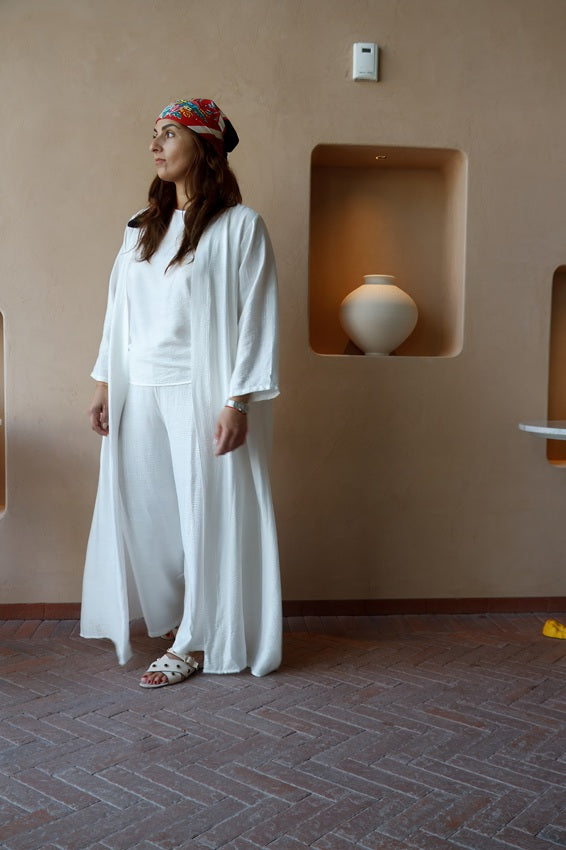 The duster drapes like poetry, while the matching wide-leg pants offer that swishy, elegant movement we all crave. It’s elevated loungewear — or chic eveningwear, depending on your mood (and your heels).